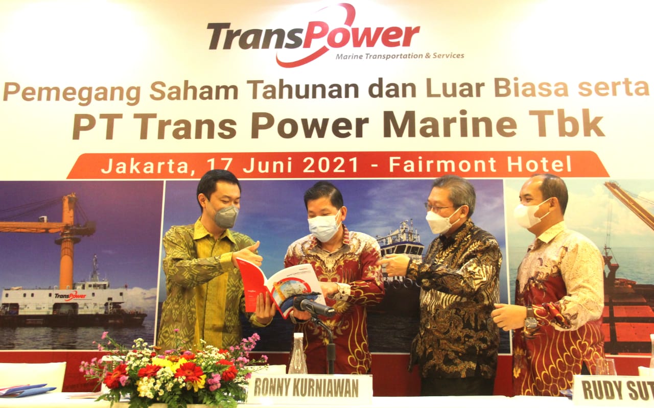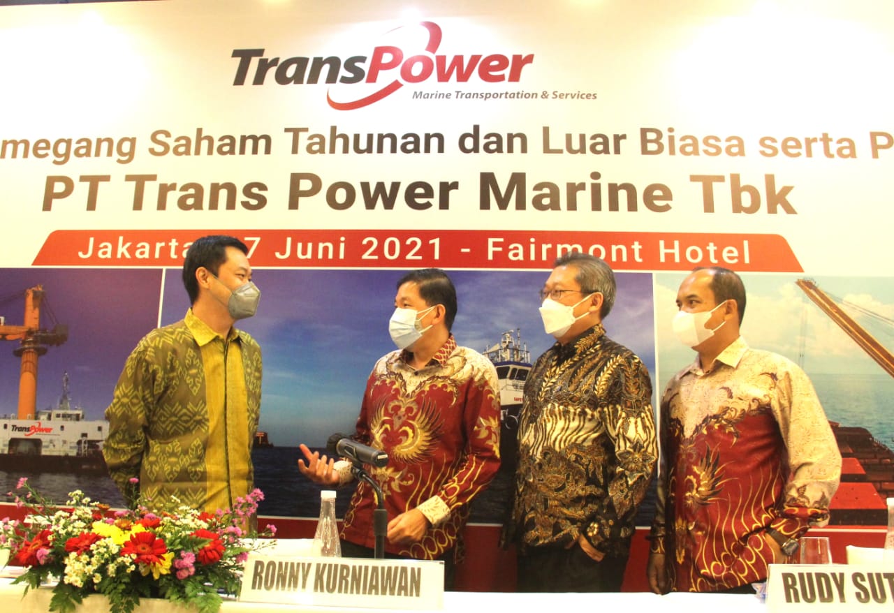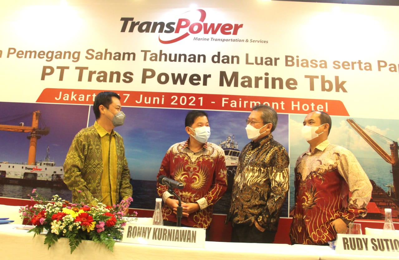 Direktur Utama PT Trans Power Marine Tbk. Ronny Kurniawan (kedua kiri), Wakil Direktur Utama Daniel Wardojo, Direktur Rudy Sutiono dan Direktur Aman Suaedi berbincang usai Rapat Umum Pemegang Saham Tahunan di Jakarta, Kamis (17/6). Perseroan menyetujui pembagian dividen tunai sebesar Rp57 miliar atau Rp22 per saham dan mencatatkan pendapatan usaha sekitar USD 2 juta pada 2020.